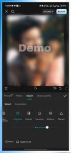 For example, what happens is, if you increase the light too much, you’ll see that it’s burning your eyes. Right? That’s not what happens. That is, increase the brightness, and if you reduce the brightness that you see here a little bit [music], your light will be much more balanced. Right? Always use this technique. Then, you get sharpened. By increasing it, you’ll notice that the quality has improved significantly. Similarly, Capcut app